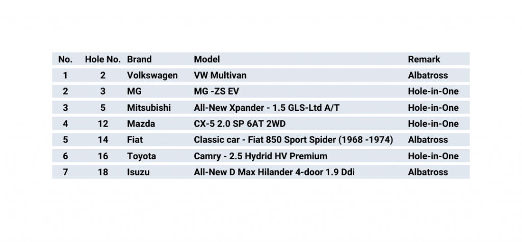 The first player to ace any of the par-three holes during tournament play will drive home with automobiles from the likes of Toyota, Mitsubishi, Mazda, and MG respectively while the first player to record an albatross on hole 14 will drive home with a Fiat provided by Grand Prix International. A brand new Isuzu awaits on the 18th hole.