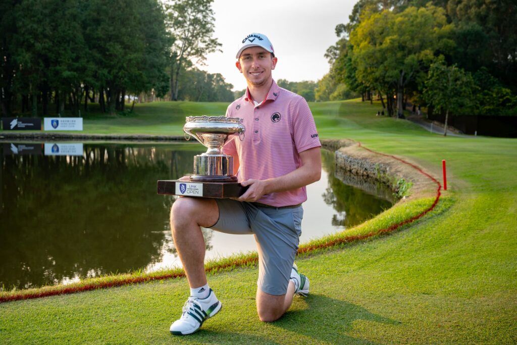 Tom McKibbin pictured with the Link Hong Kong Open trophy last season. Picture by Graham Uden/Asian Tour.